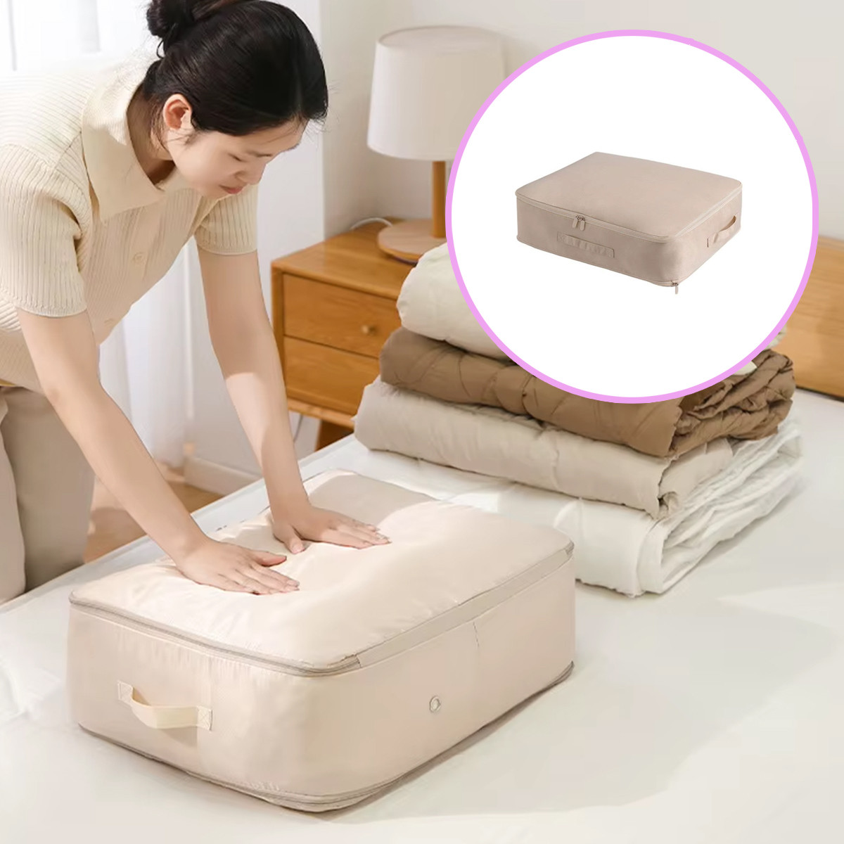 Mantene tu hogar organizado con esta bolsa comprimible de gran capacidad, ideal para guardar ropa de cama, prendas de invierno y acolchados voluminosos. Su diseño con tela de poliester y cierre doble protege tus textiles del polvo, la humedad y los malos olores. Su sistema de compresion permite que llenes la bolsa expandida y luego la comprimas, reduciendo su volumen al mínimo para aprovechar mejor el espacio. Perfecta para guardar en armarios, debajo de la cama o para mudanzas.